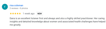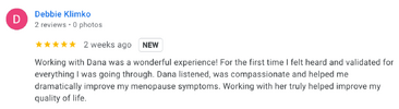 Working with Dana was a wonderful experience. For the first time I felt heard and validated for everything I was going through. Dana listened, was compassionate, and helped me dramatically improve my menopause symptoms. Working with her helped improve my quality of life.
