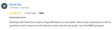 Working with Dana has made a huge difference in my health. She is very responsive to all my questions and comes up with solutions that work for my body. Love the MME program.